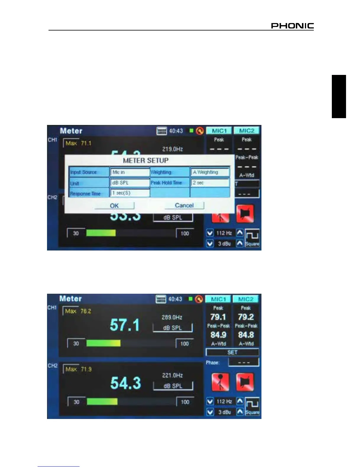 2. Select “Mic in” as your input source. The unit will automatically be set to dB SPL (gure 46).