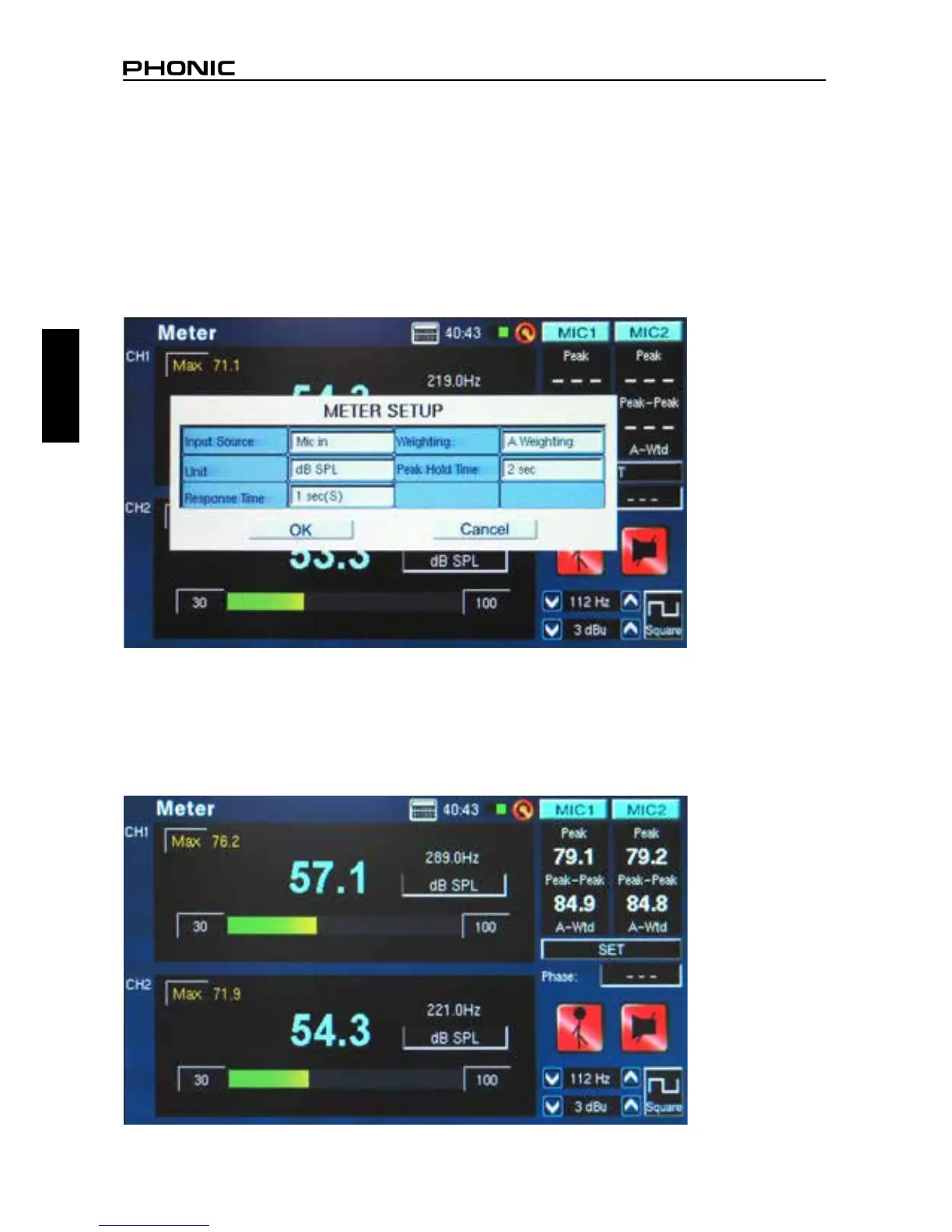 La función de medidor puede tomar cálculos en dB SPL (a través del micrófono incorporado), dBu, dBV