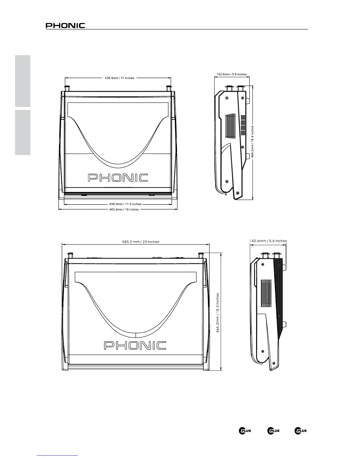 Phonic POWERPOD 1860 Plus - Dimensions; Dimensions: K-12 Plus and 1860 Plus; Dimensions: K-16 Plus