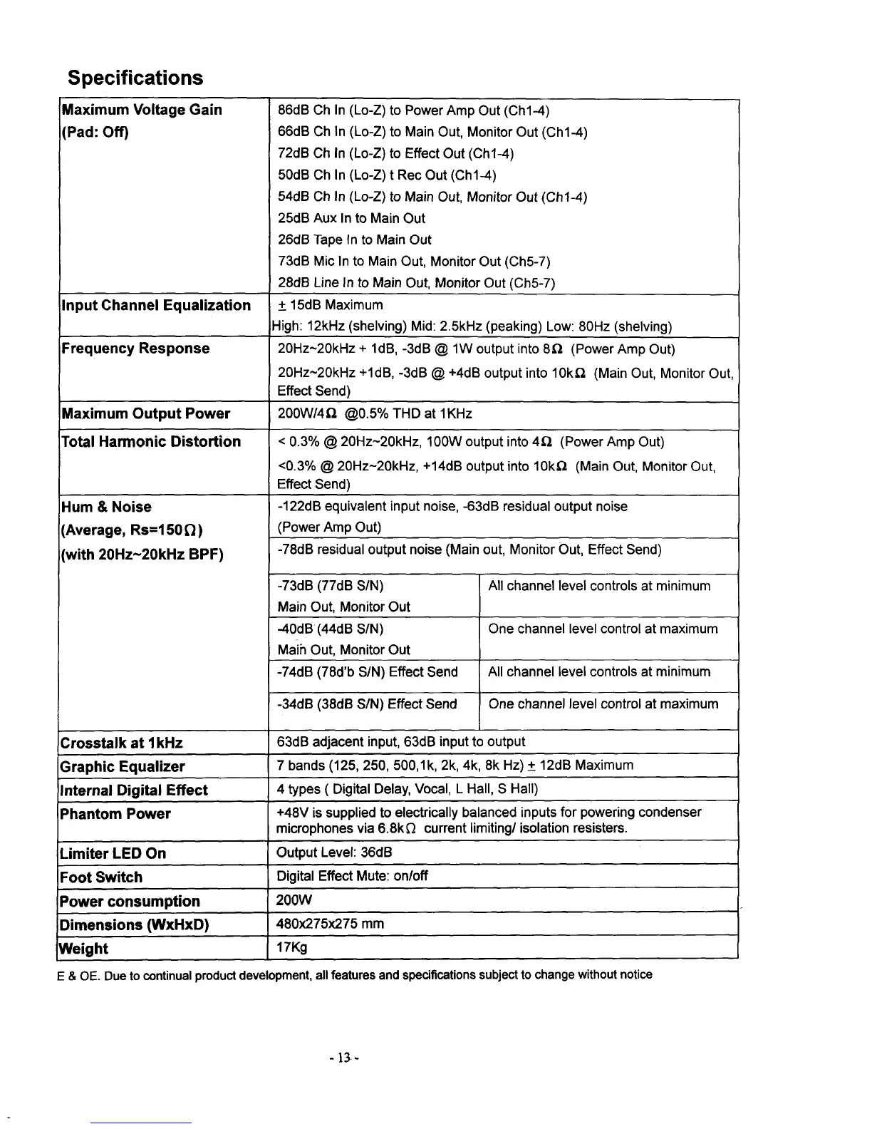 Phonic Powerpod 7 - Specifications; Maximum Voltage Gain; Input Channel Equalization; Frequency Response