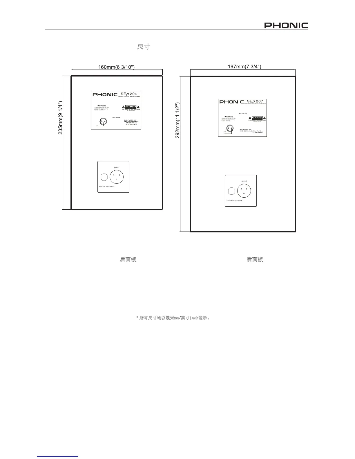 所有尺寸均以毫米mm/英寸inch表示。