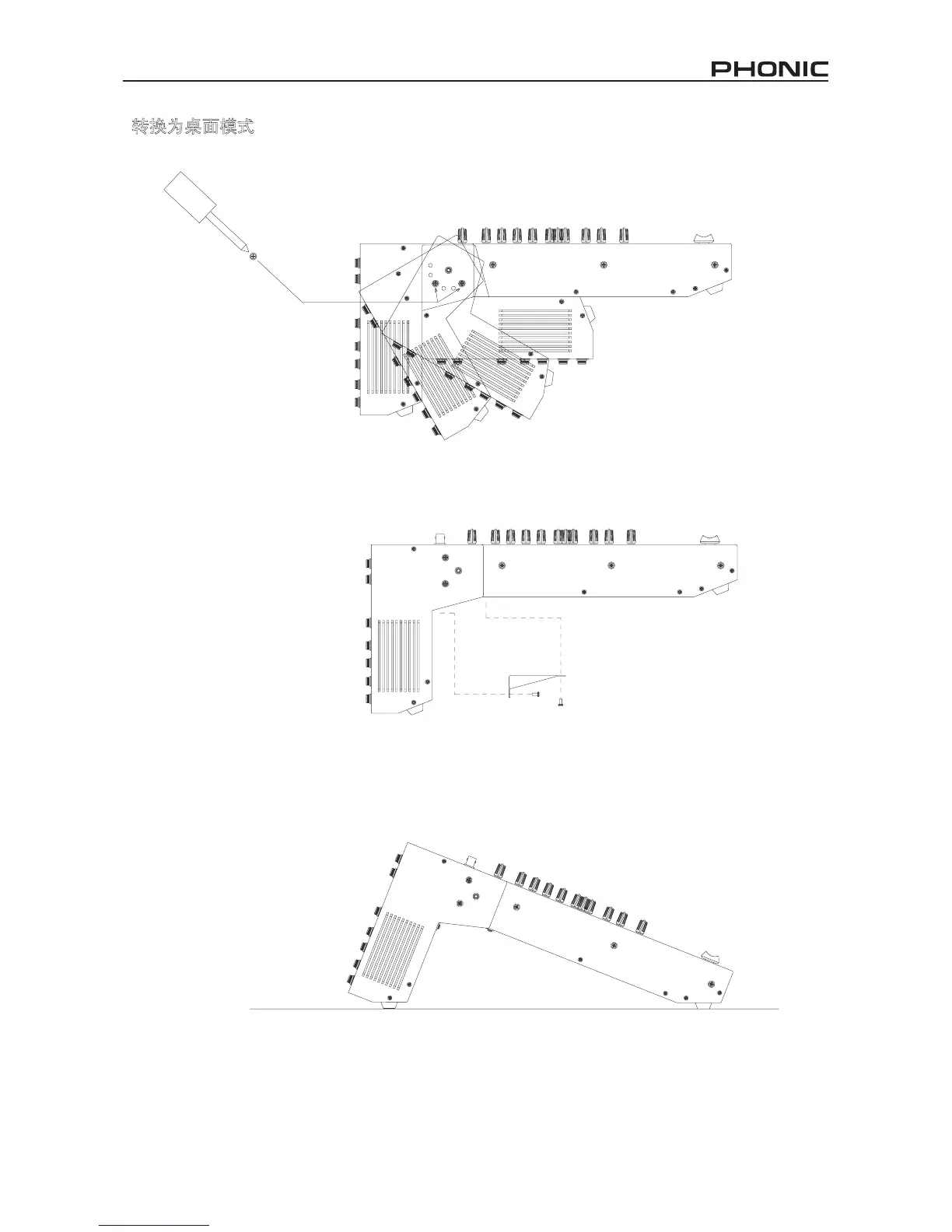 垂直固定连接面板与调音台底板,即可方便地用作台式混音控制台。