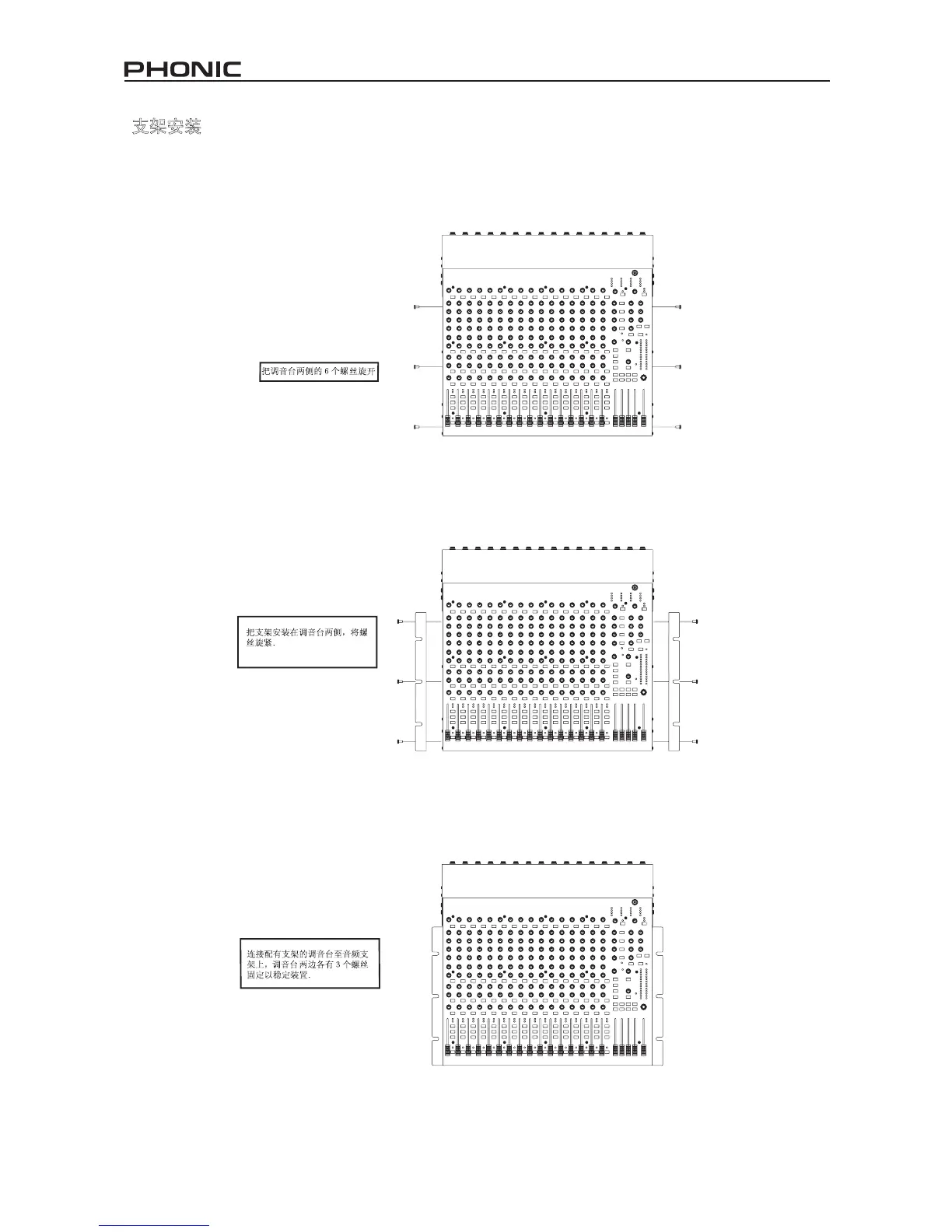 Sonic Station 16调音台放置于支架,连接面板既先旋转至与调音台底板平行,此位置最适于放置在支架上,节省空间.