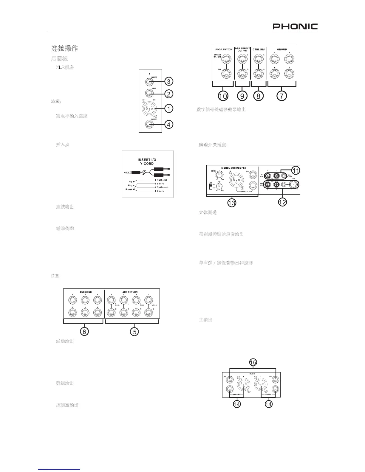 1/4”耳机插座,信号会自动复制到右声道.此功能不适用辅助