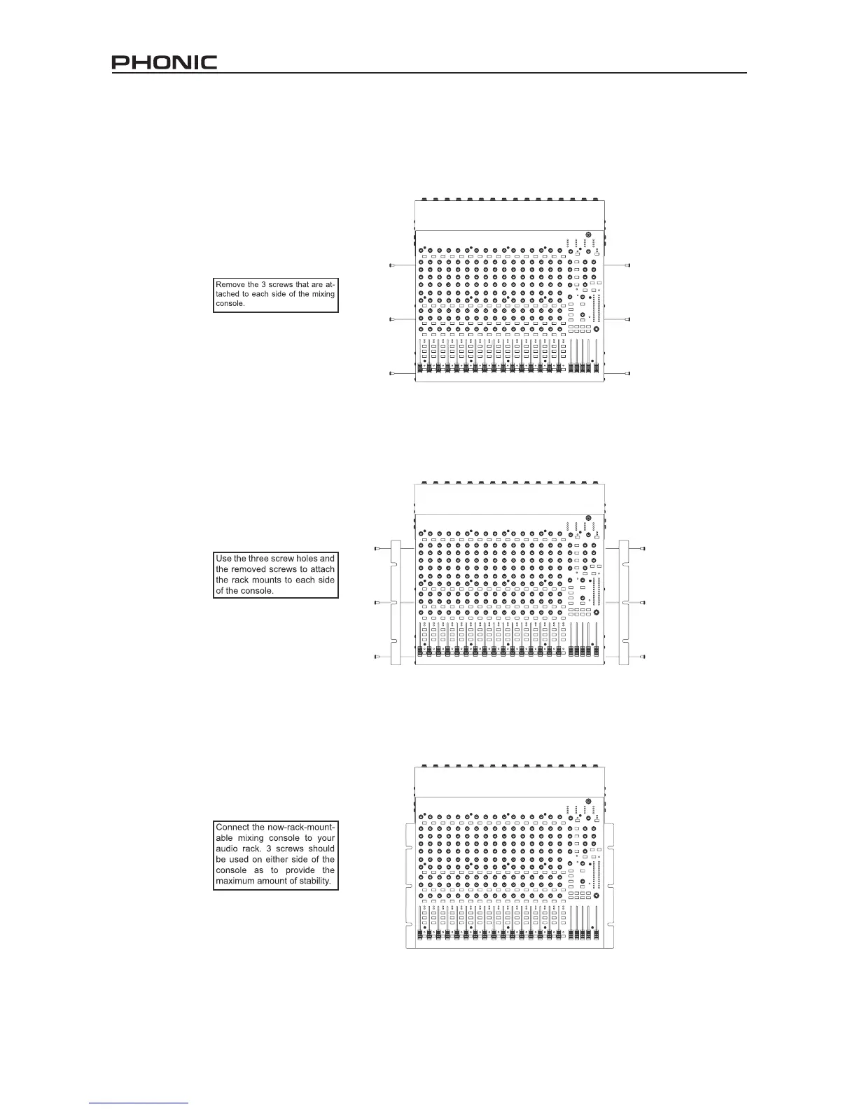 To install the rack mount kit to the Sonic Station 16 mixer, the connecting panel should be rst rotated to sit parallel to the mixer’s base.