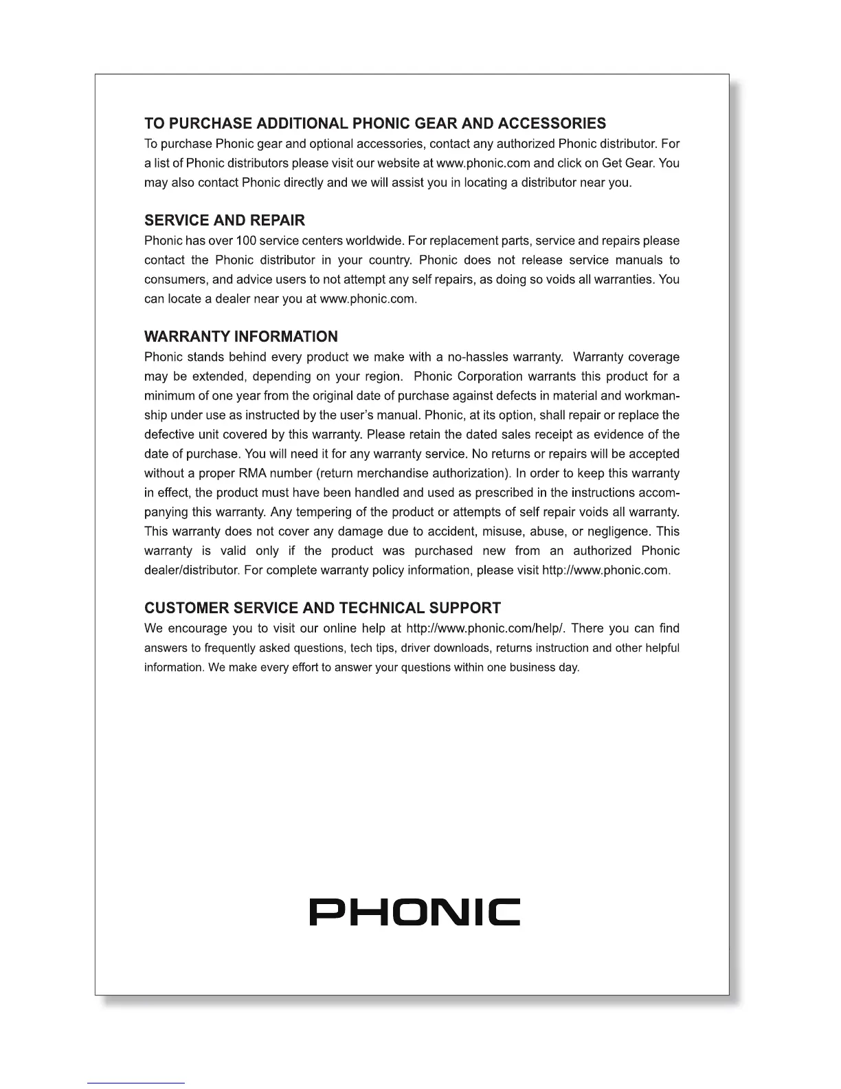 Phonic SUMMIT - Support and Service Information; Purchasing Additional Gear and Accessories; Service and Repair Information; Warranty Policy