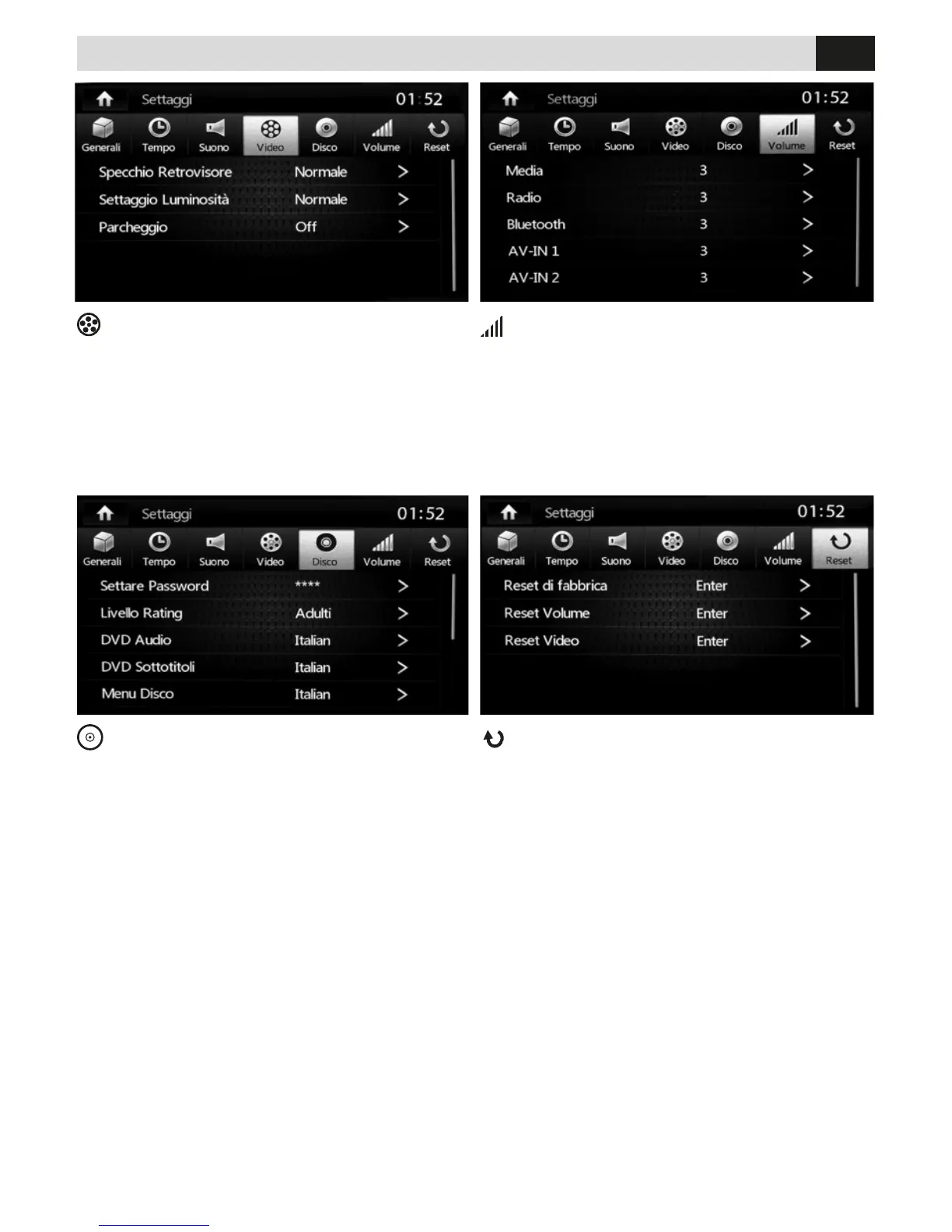 • RESET: FACTORY - VOLUMEN - VIDEO