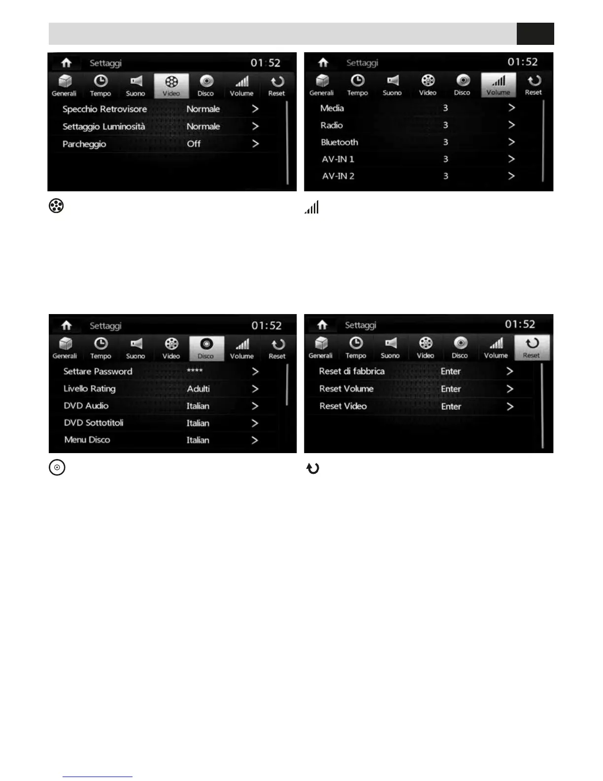 • RESET: FACTORY - VOLUMEN - VIDEO