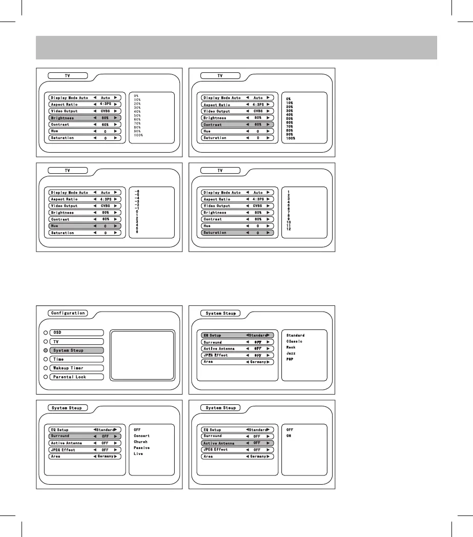 In the Configuration menu, enter System Setup and press CH+/- </> to select the item and adjust the