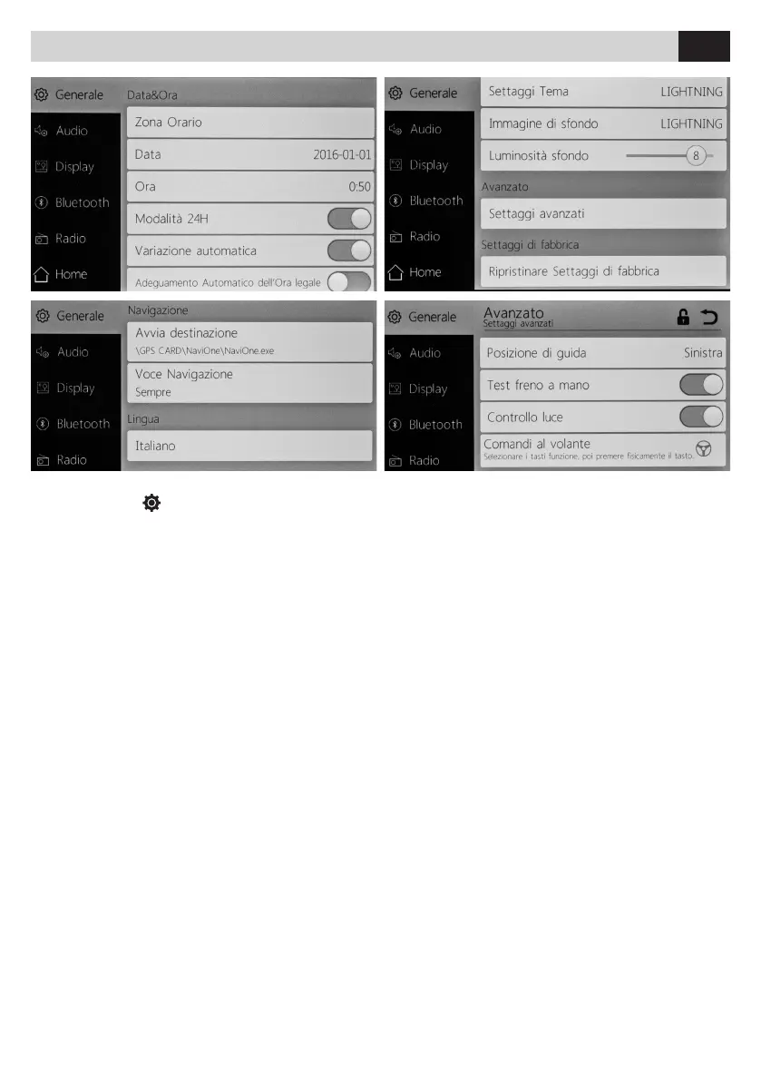 Presionar el icono en la pantalla del menú principal para modificar: Generales, Audio, Pantalla, Bluetooth,