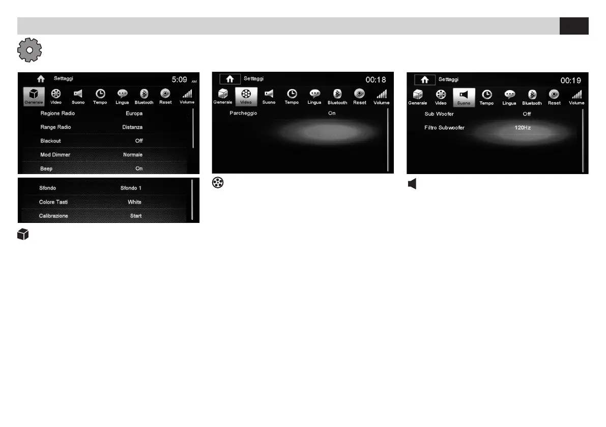 Presionar el icono Setup en la pantalla del menú principal para modicar los siguientes ajustes: generales, video, sonido, fecha y horario, idioma, Bluetooth,