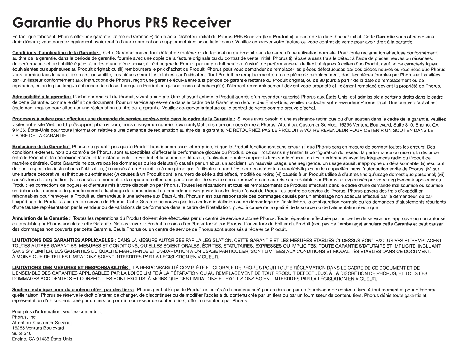 nous envoyer un courriel a warranty@phorus.com ou nous ecrire a Phorus, Attention: Customer Service, 16255 Ventura Boulevard, Suite 310, Encino, CA