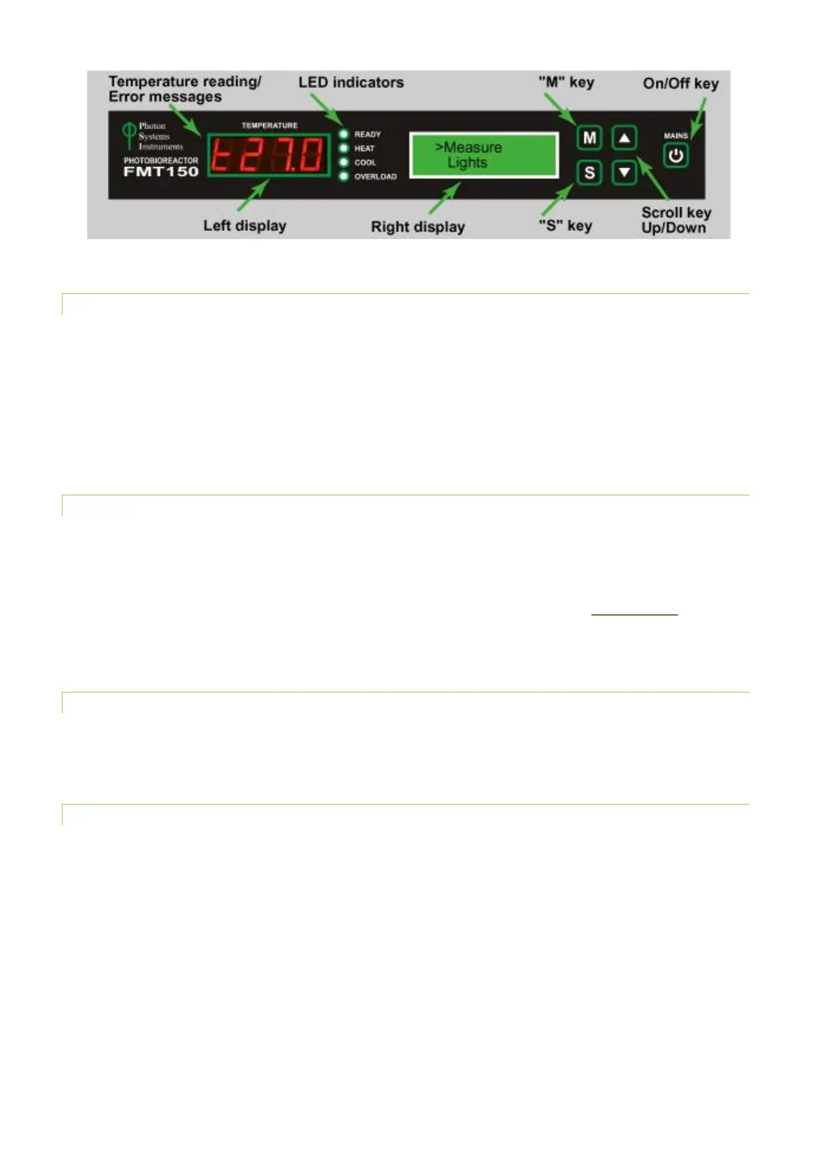 Displays the current temperature in the cultivation vessel and error messages if any problems with the FMT150 occur.