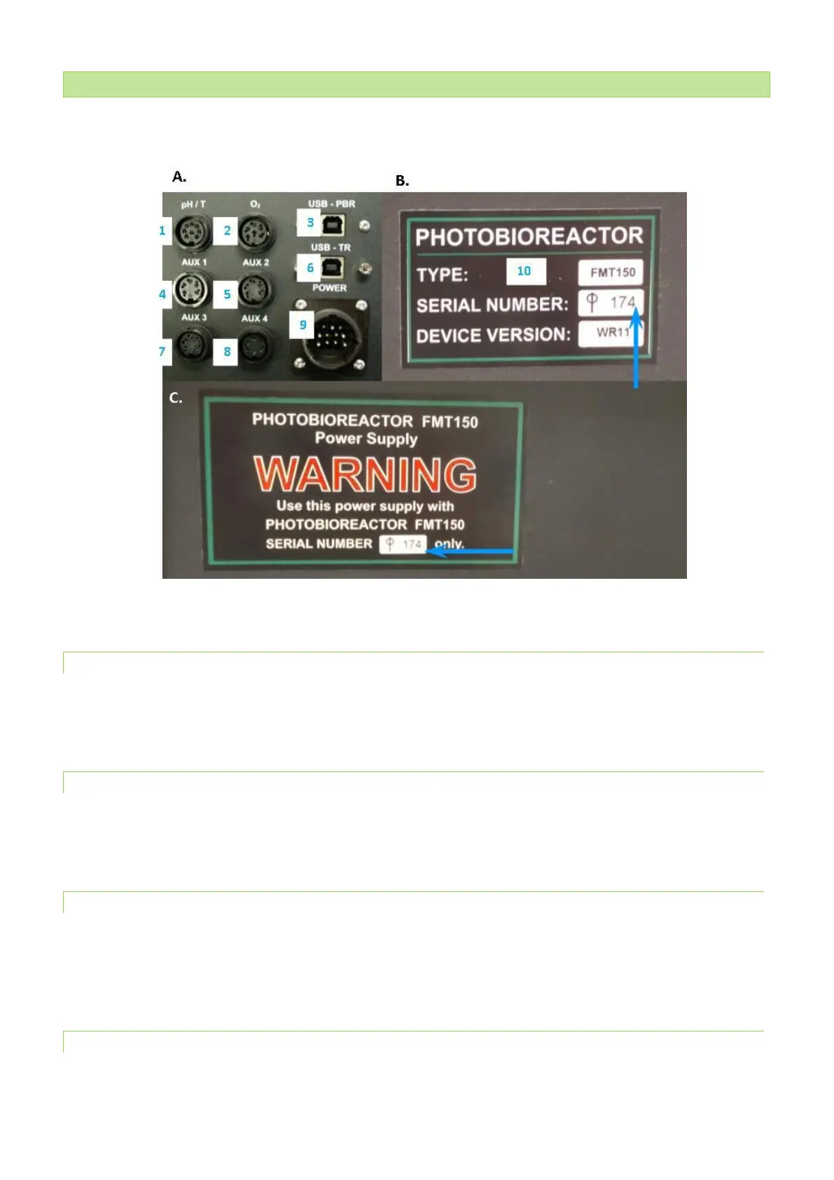 on the front panel of the PBR FMT150 unit. C) Rear panel of the power supply with the serial number (blue arrow).