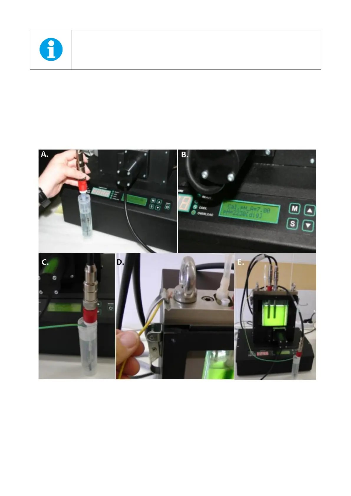 Fig. 17 pH sensor calibration. A) Electrode is placed into the solution of pH 7. B) Reading of the measured value. C, D, E) Grounding with