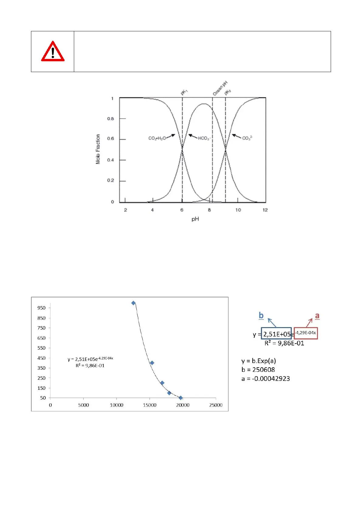 calibration curve. Right: Exponential fir equation with depicted constants a and b.