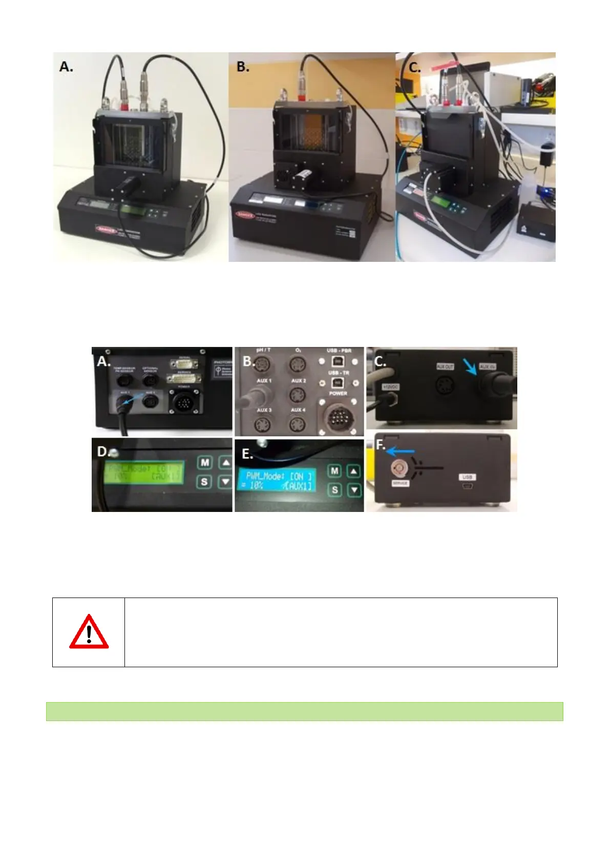 D, E) Manual Stirrer control via the PWM_Mode on the front panel of PBR (D – FMT150.1 version; E – FMT150.2 version). F) Horizontal