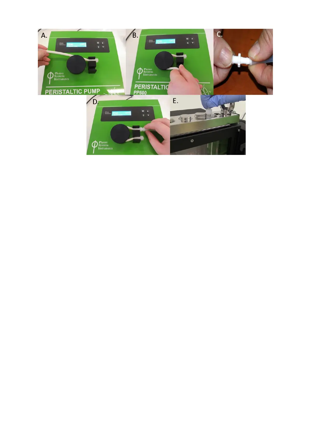 attached to the silicone tubing and connected with the tubing of the peristaltic pump. E) Tubing from the peristaltic pump is connected