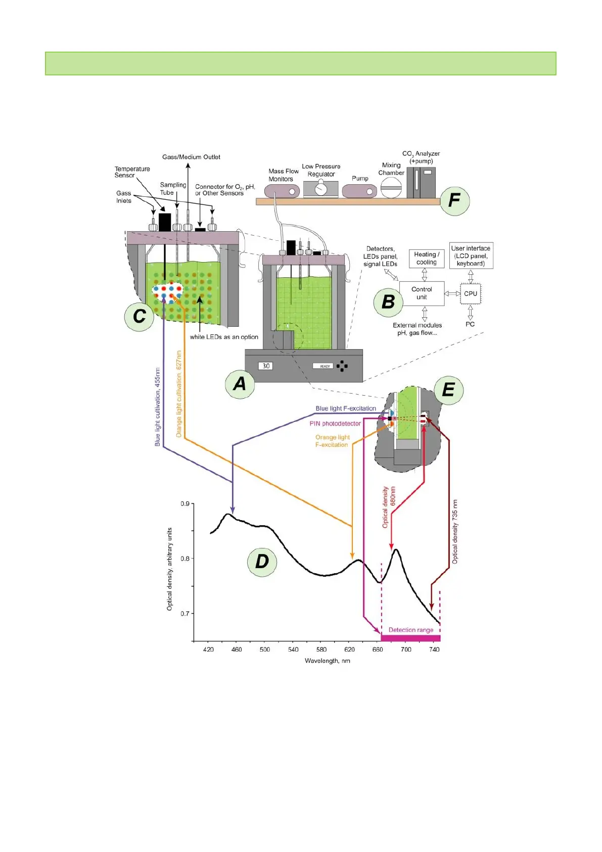 top-to-bottom view) of the fluorometer and densitometer. F) Schematic representation of optional gas supply components and