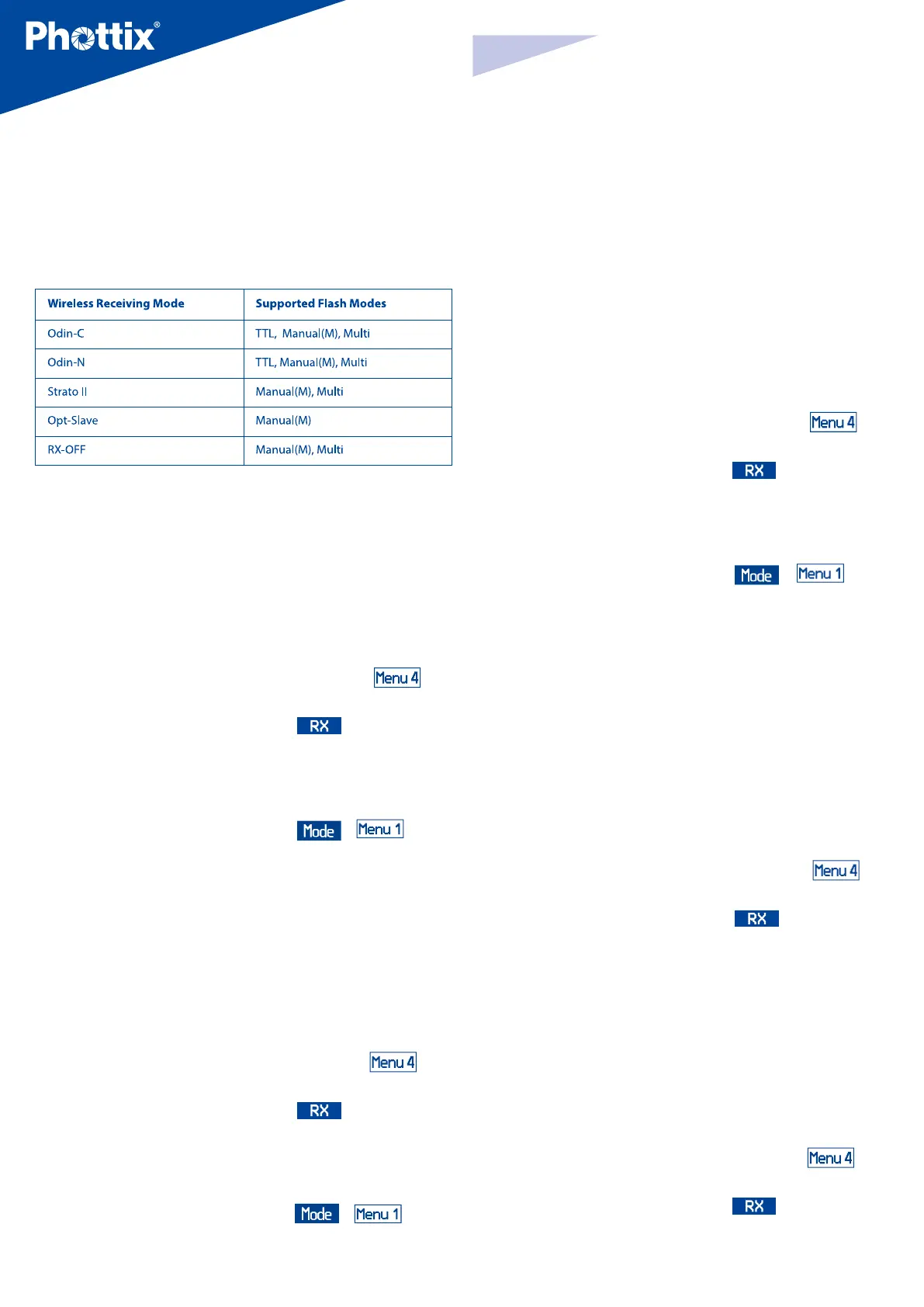 modes: Odin-C, Odin-N, Strato II, Opt-Slave and RX OFF. Please see below for