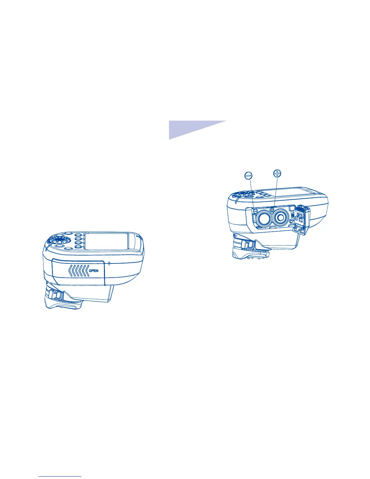 1. 按住 Phottix Laso 发射器电池盖 , 依所示