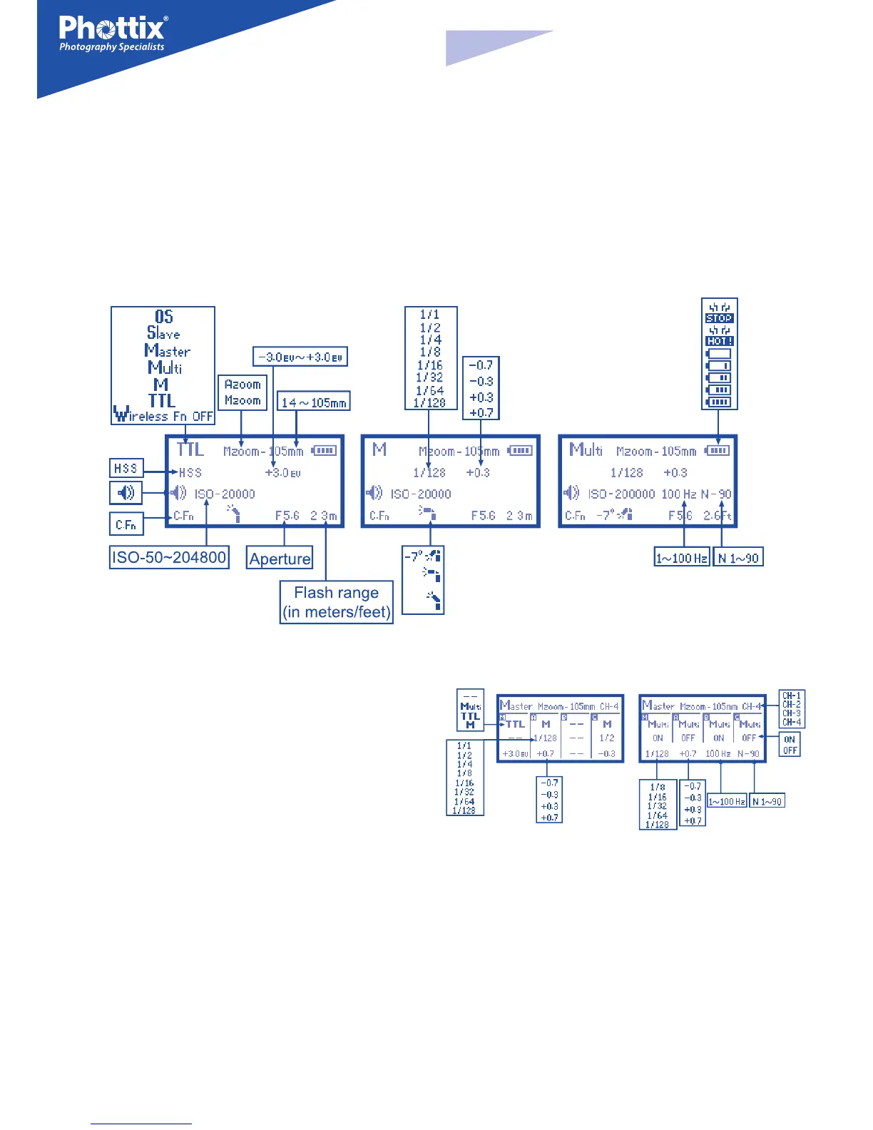Modalità ash: TTL, Manuale (M), Multi, OFF (- -)