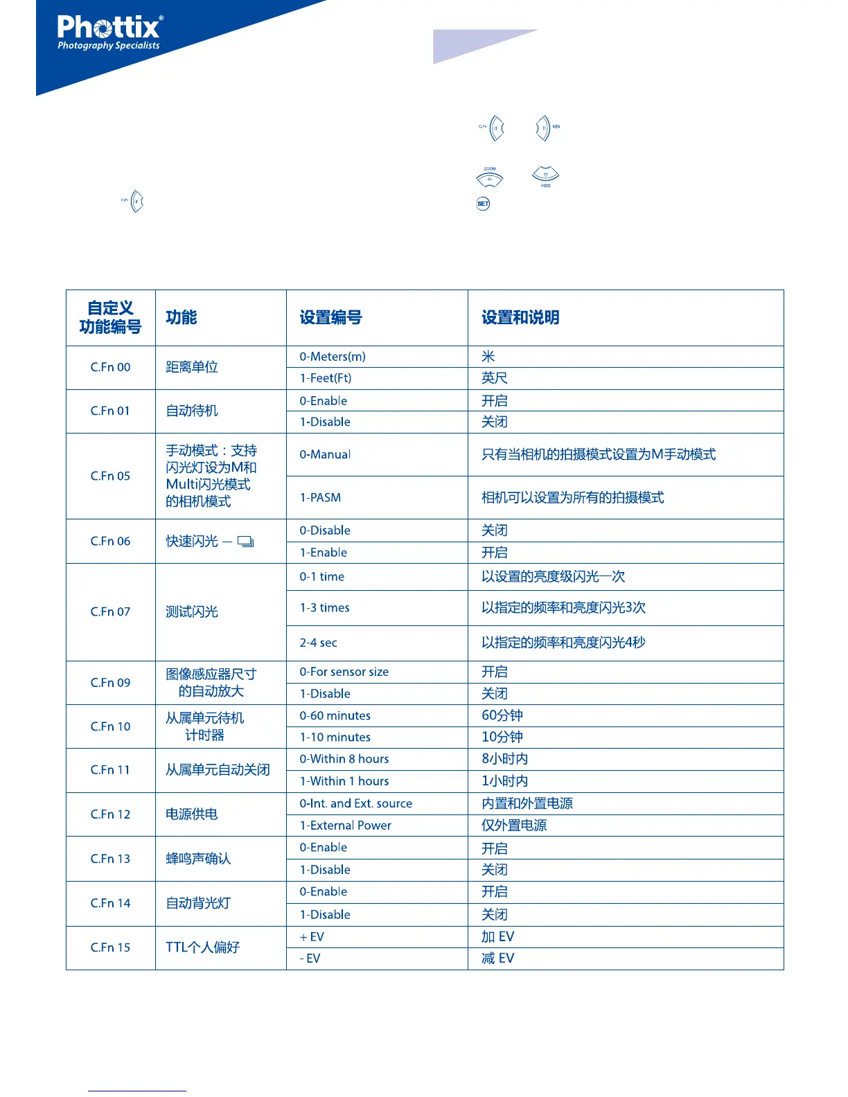 2. 按钮将循环自定义功能菜单项 C.Fn