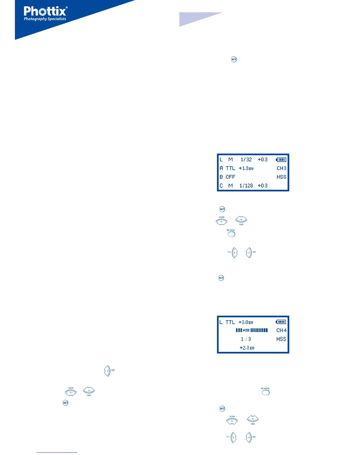 en modo TTL o Manual, así como controlar tres grupos (A, B, C) – ajustando los