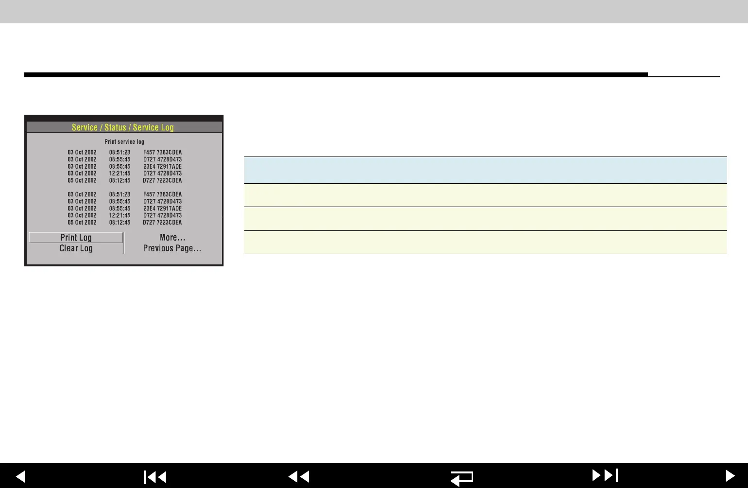 Service Log Select SERVICE LOG on the SERVICE/STATUS submenu to view the device service