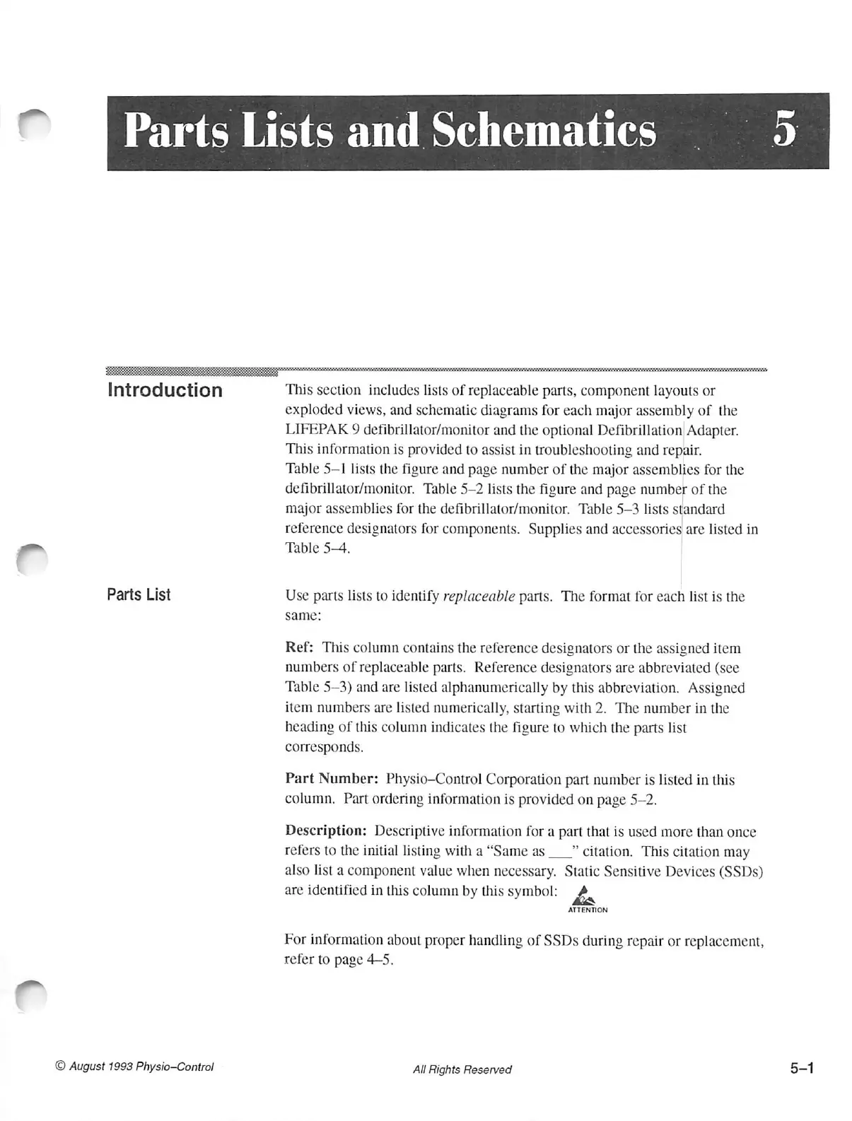Physio Control LIFEPAK 9 - Parts Lists; Schematics; Introduction; Parts List