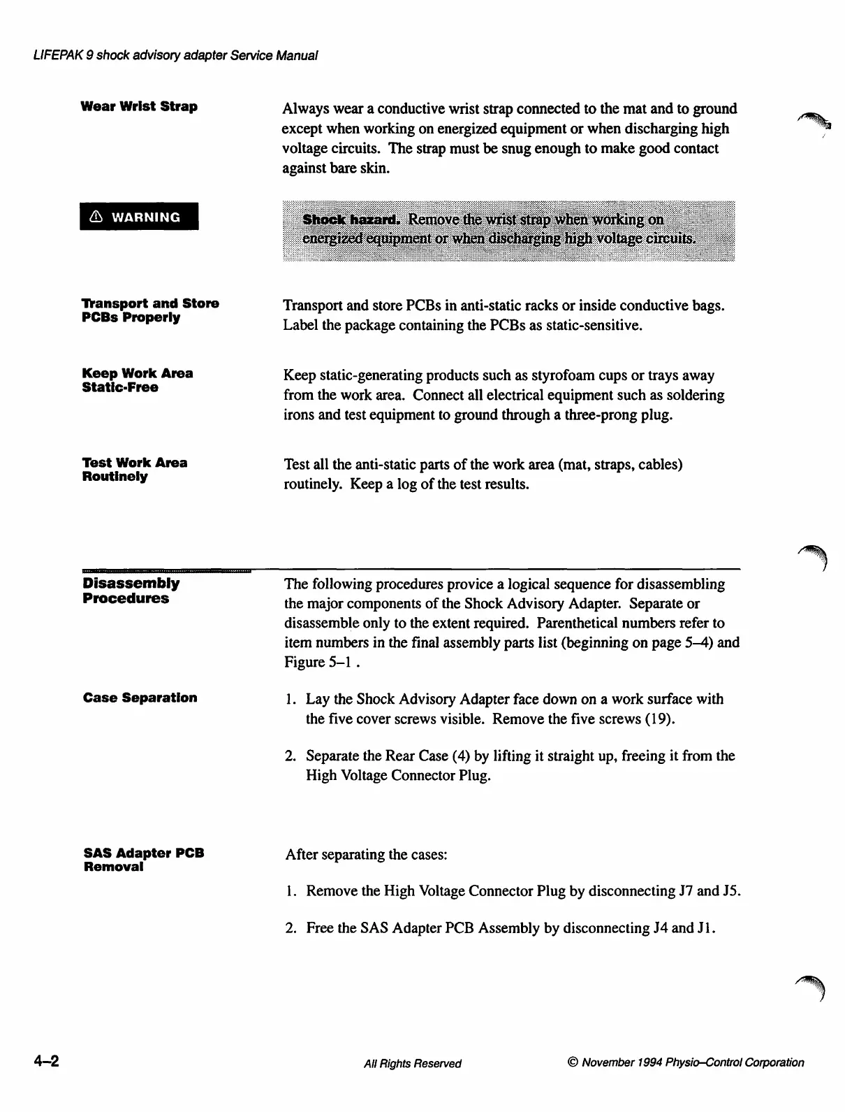 Physio Control LIFEPAK 9 - Case Separation; Disassembly Procedures; Keep Work Area Static-Free; SAS Adapter PCB Removal