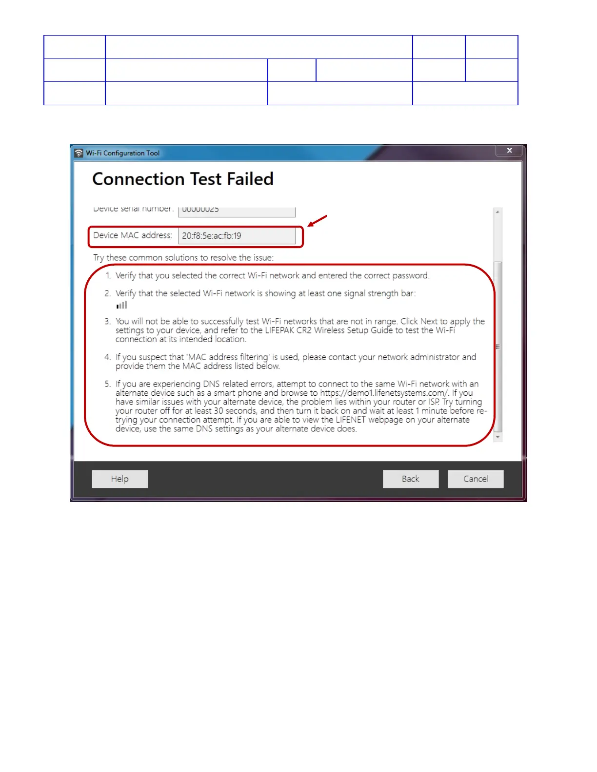 Test Connection failed, the CR2 MAC address will be displayed in Connection Test Failed window.