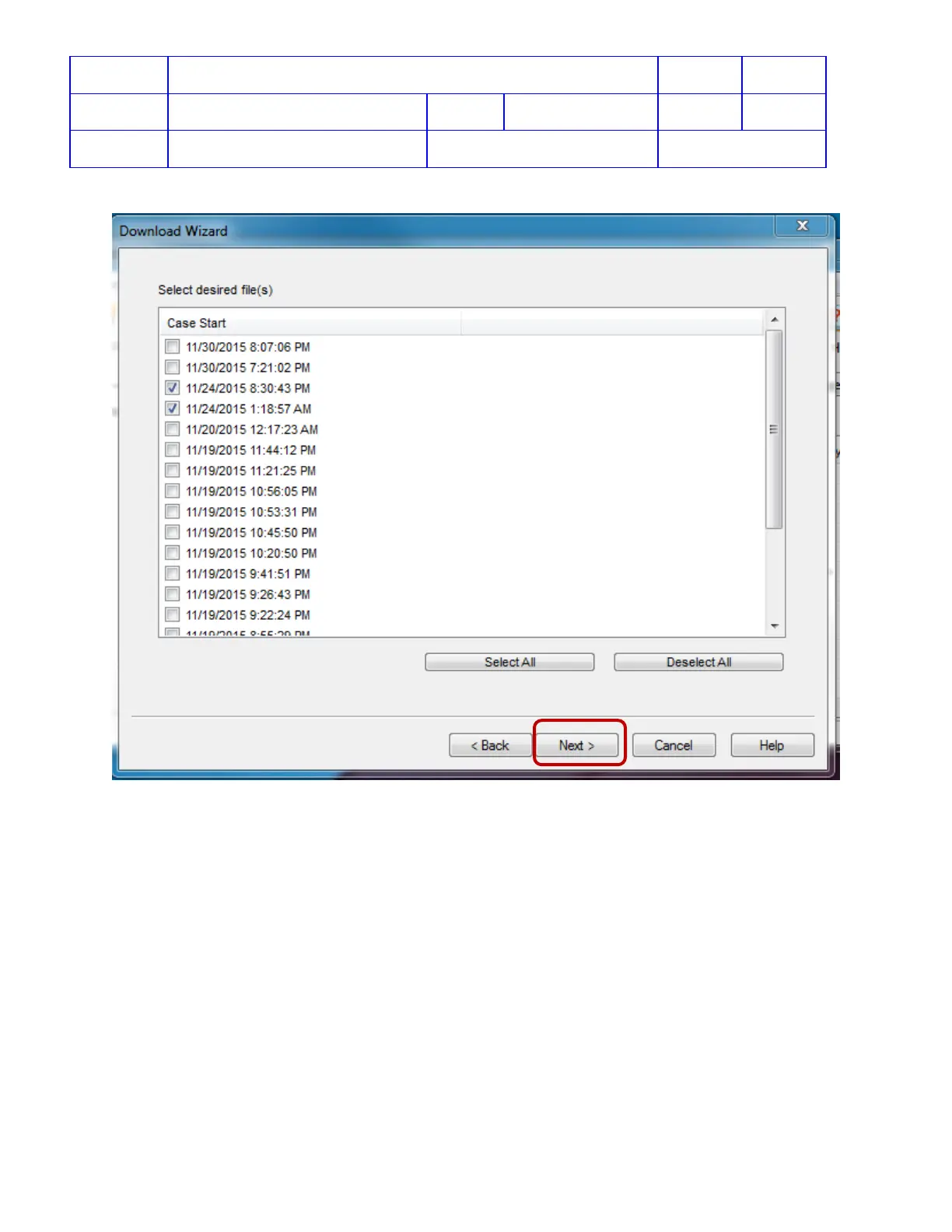 6. Select desired files to download, and click Next>.