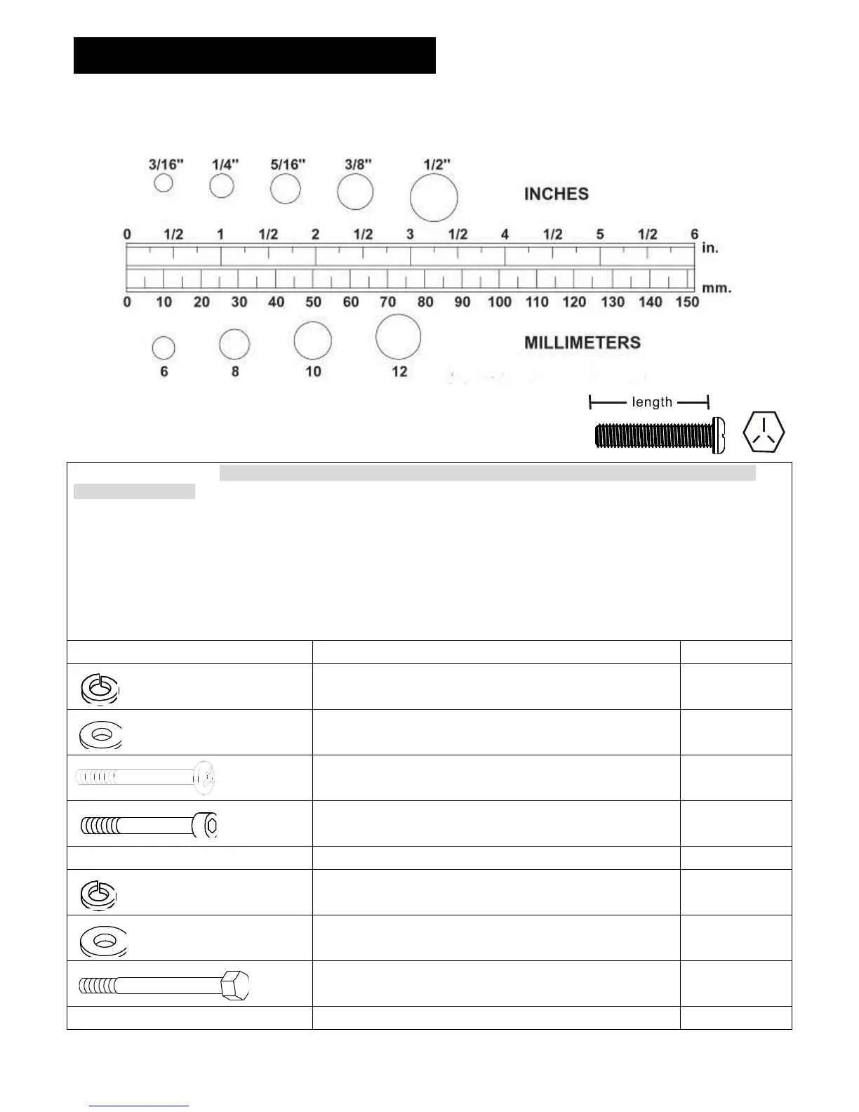 diameter. User the small scale to check the length of the bolts and screws. Do not dispose of the packing material until the