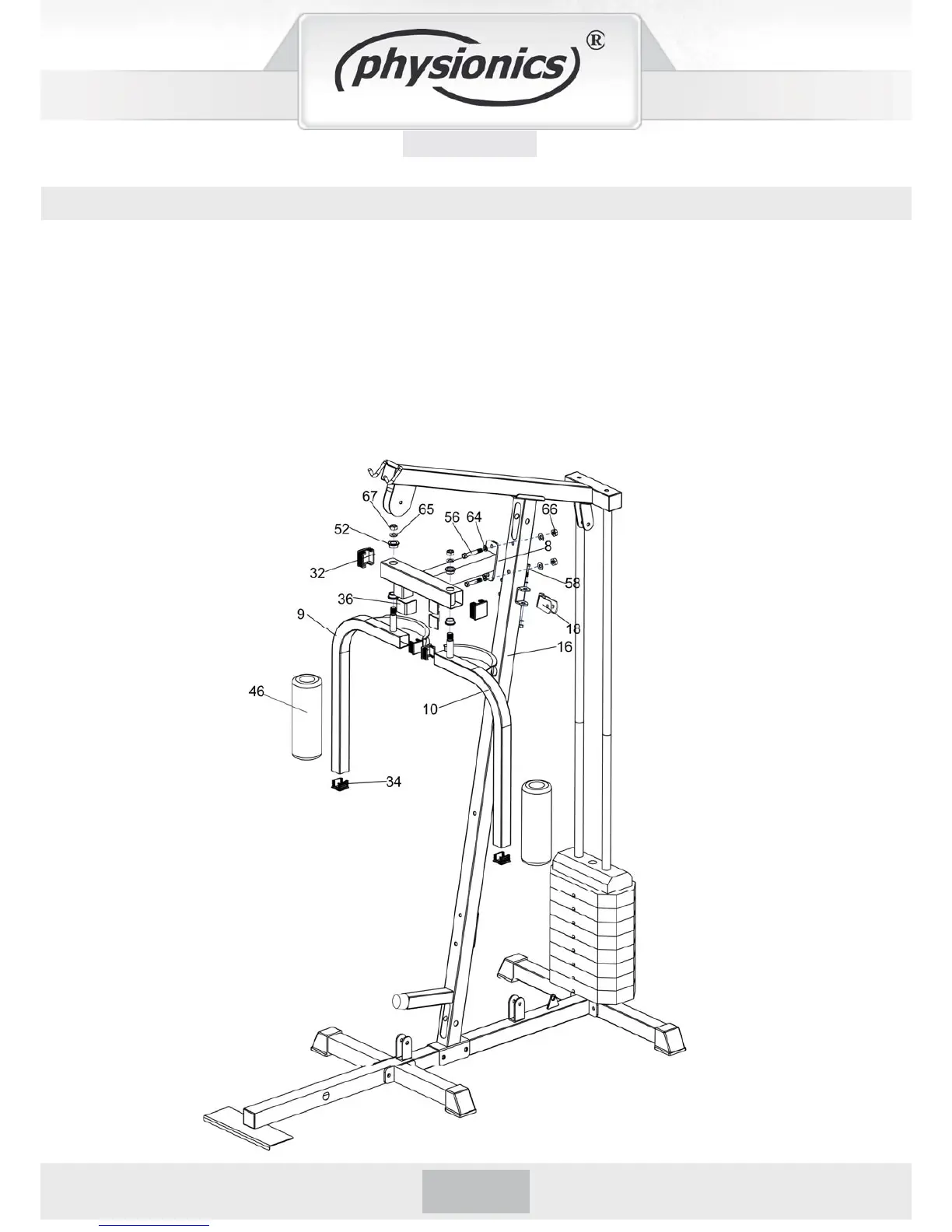 1. Attach the connecting part (8) to main frame (up) (16), secured with parts hex bolt (56-2pcs),