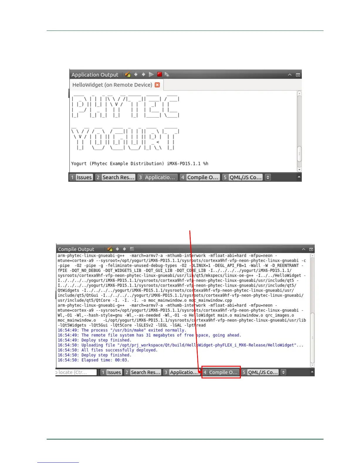 After the target is successfully deployed on to the target the Application Output frame is