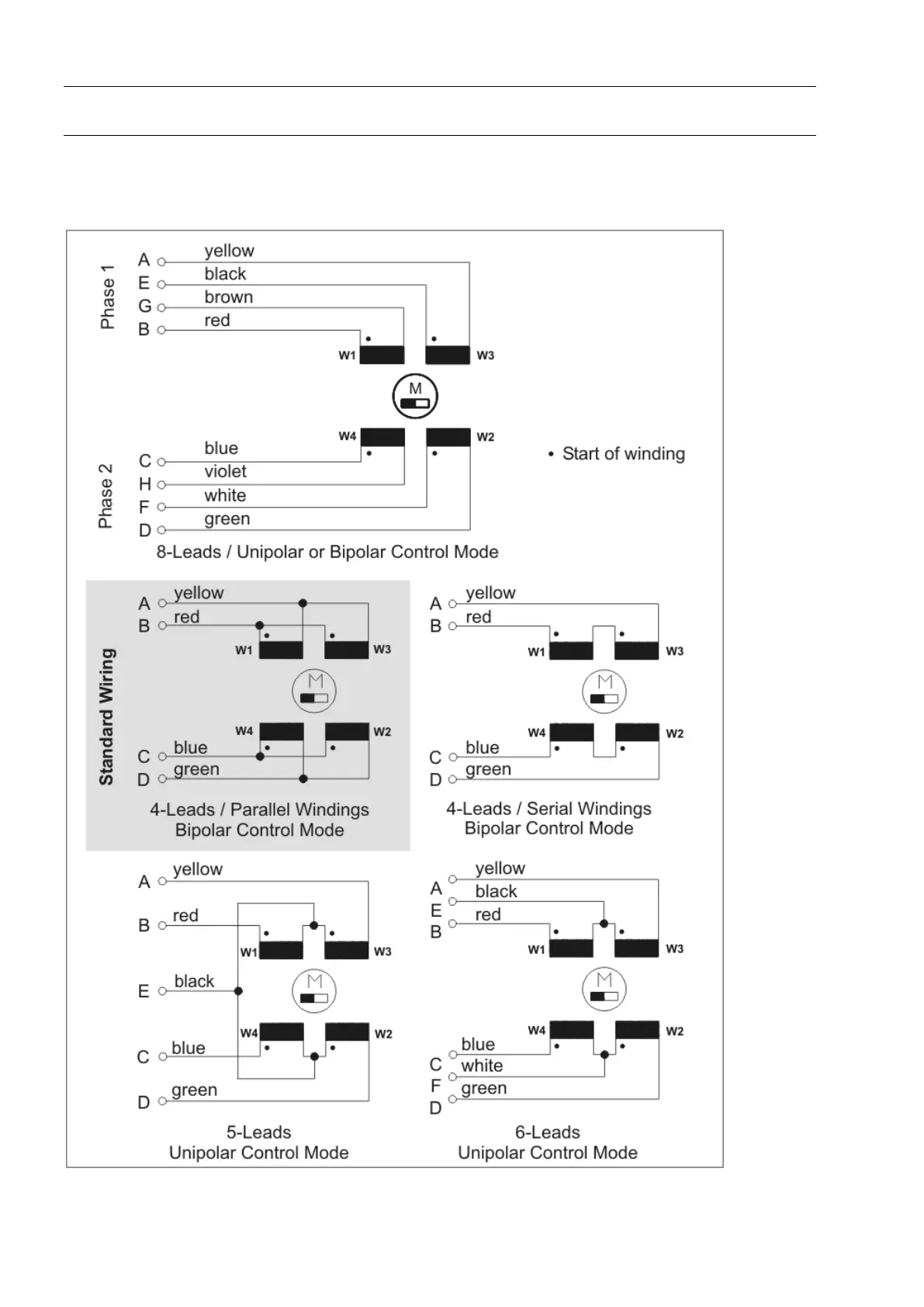 can be connected differently. Standard is 4-leads wiring with parallel connected windings