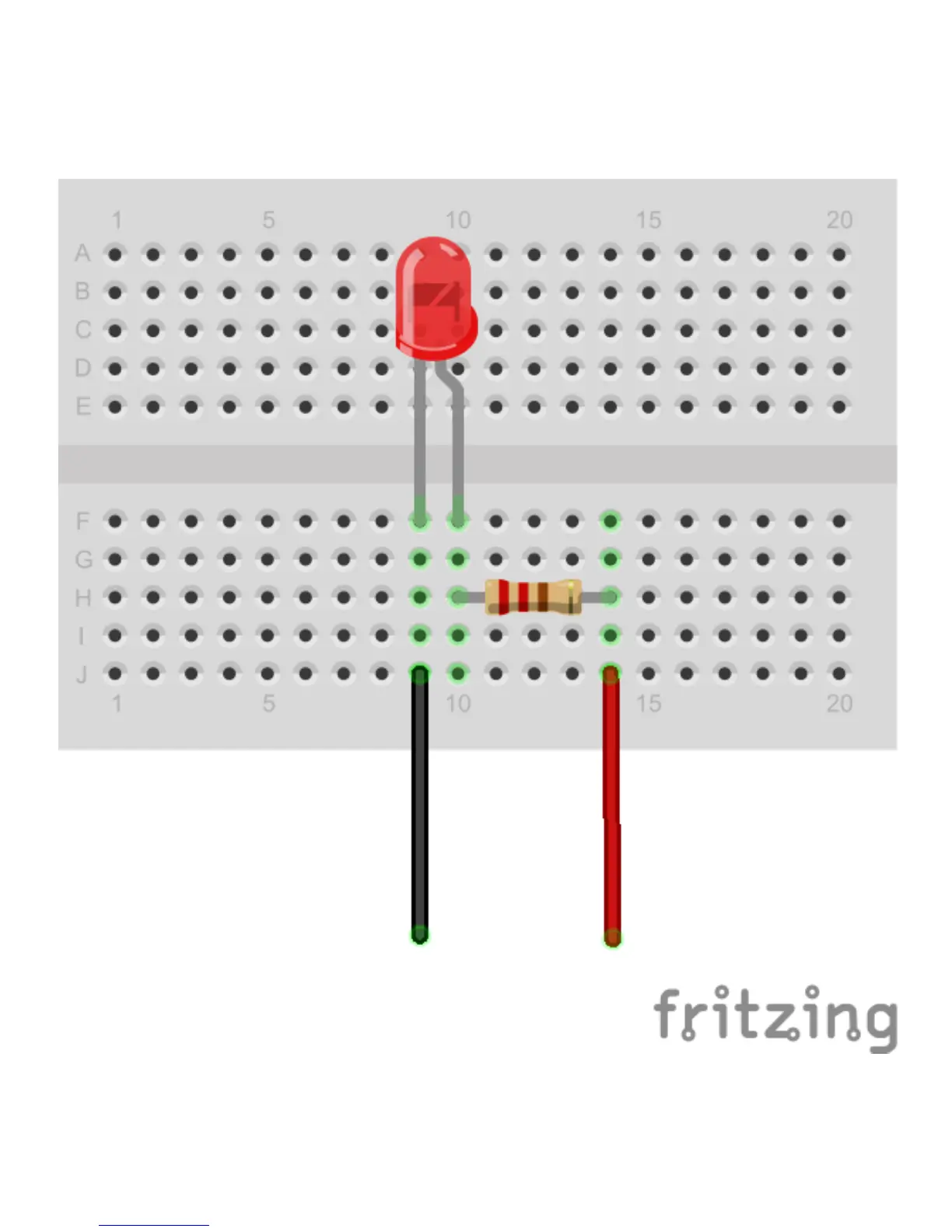 Use a simple breadboard to build up this LED circuit. Connect the anode of the LED (the long wire) to one end
