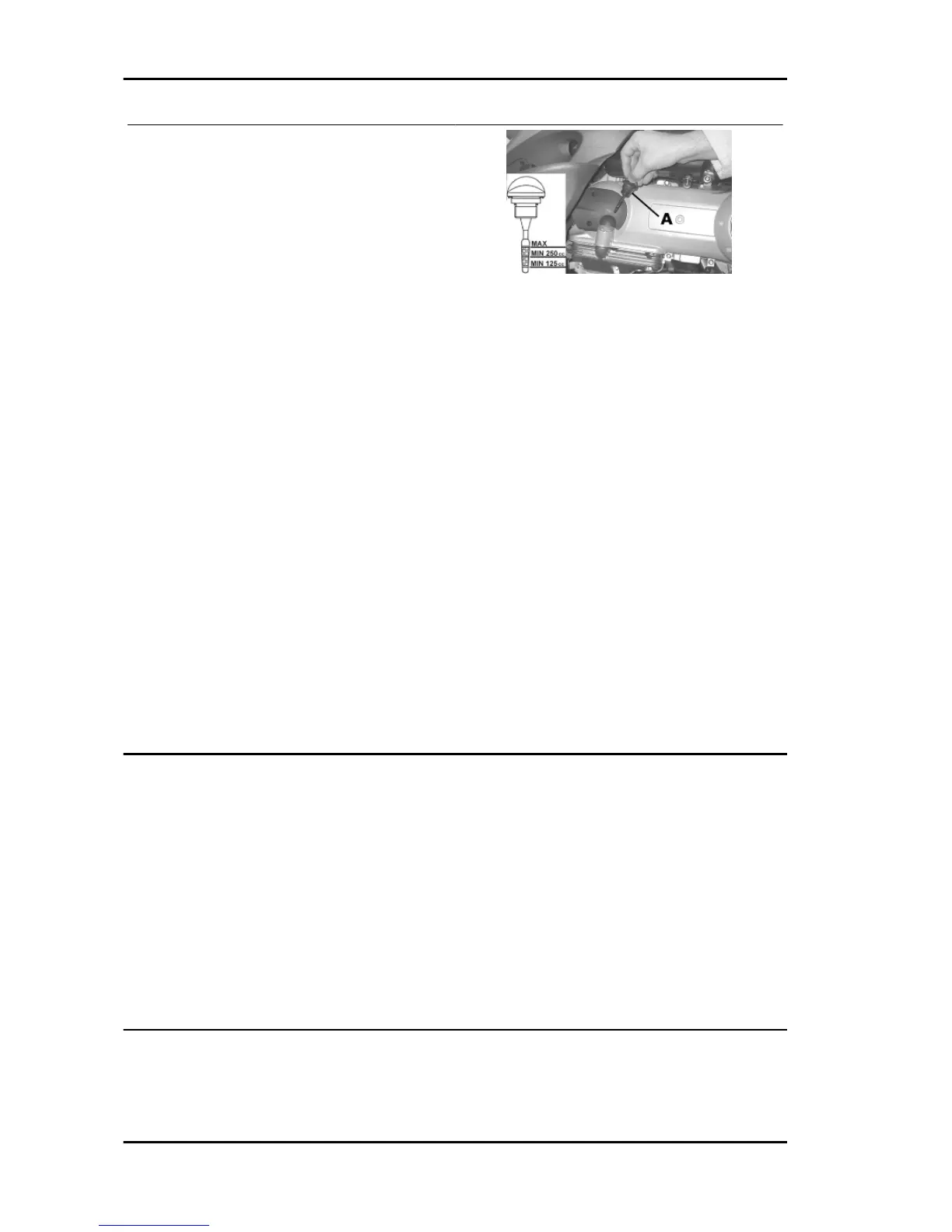 Restoring the level between the MIN and MAX reference marks requires ~ 400 cm³ of oil.