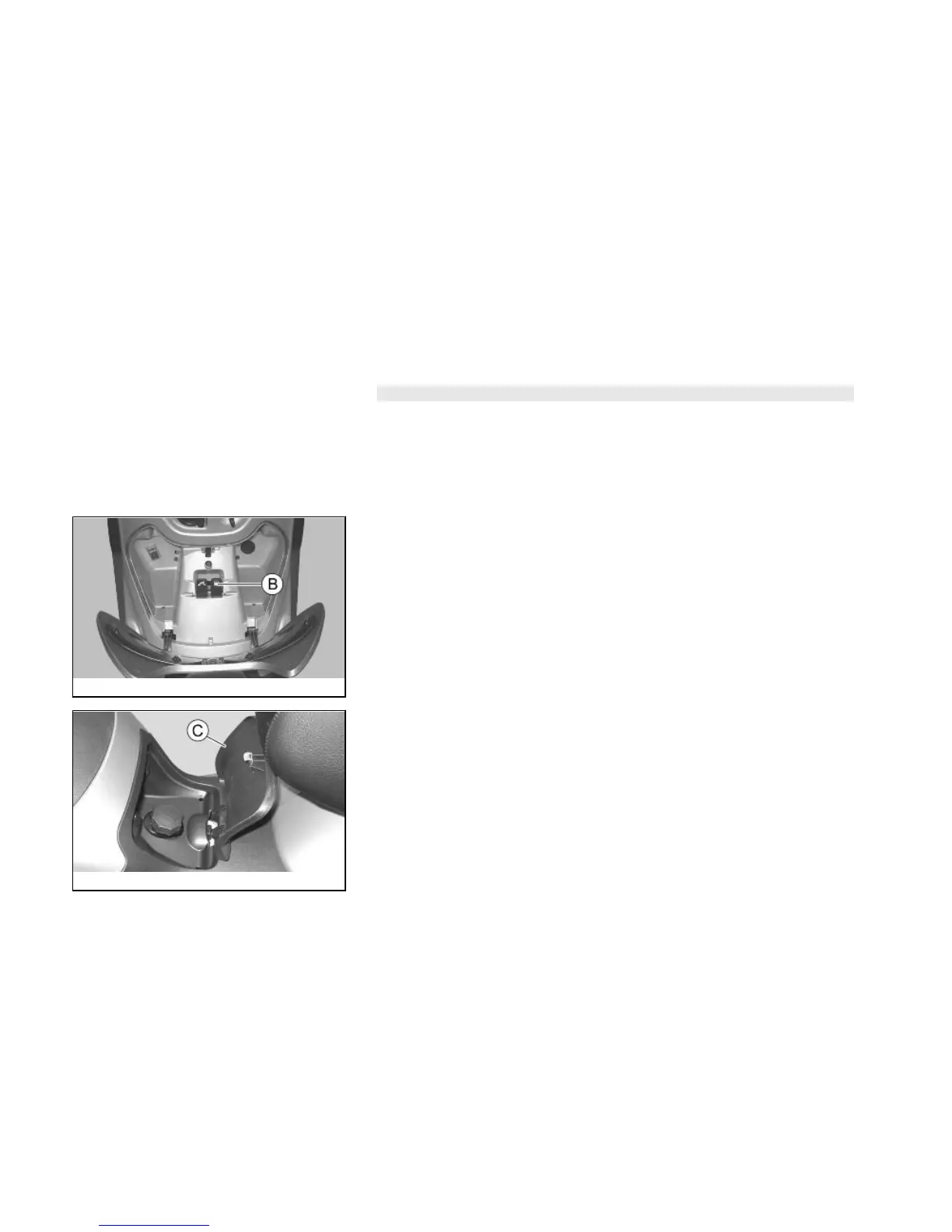 down. Press lever «B» and open the cover over the fuel tank cap «C».