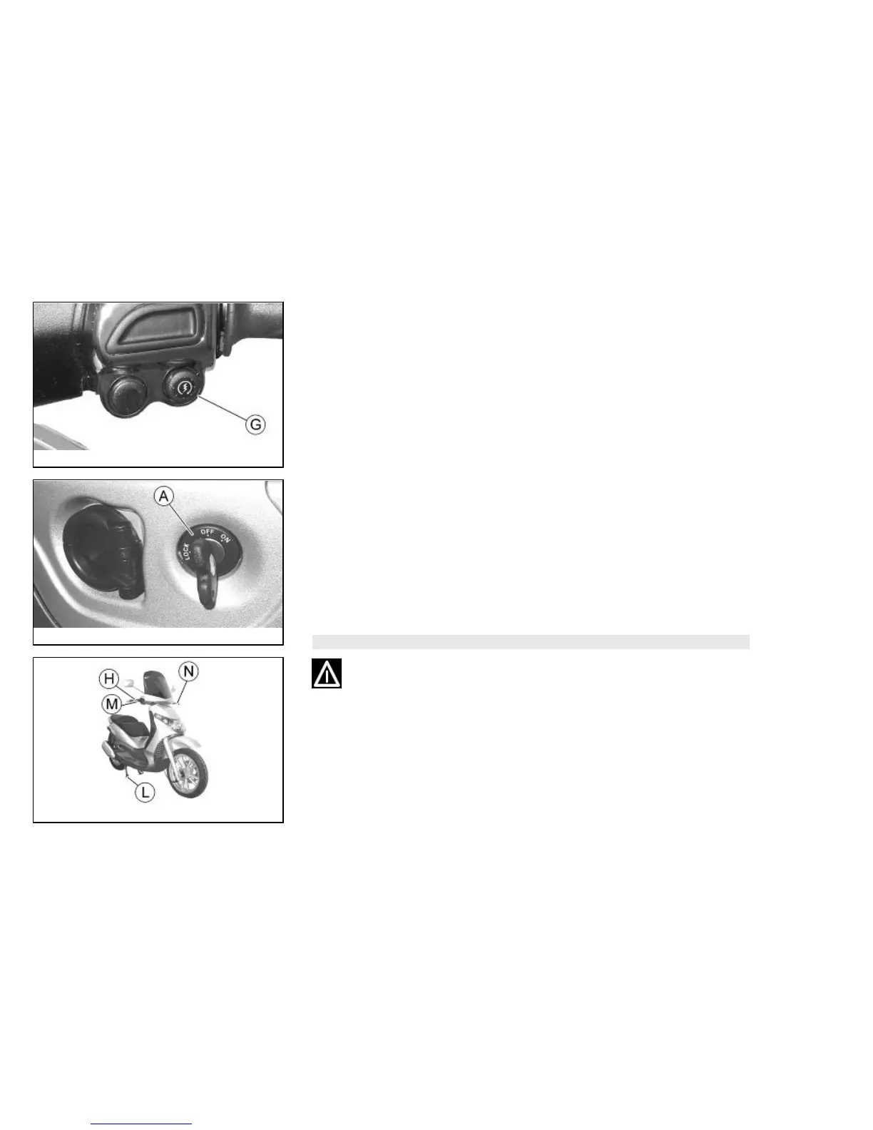 left hand-side brake lever, «N», while pressing the engine starter button, «G», as this