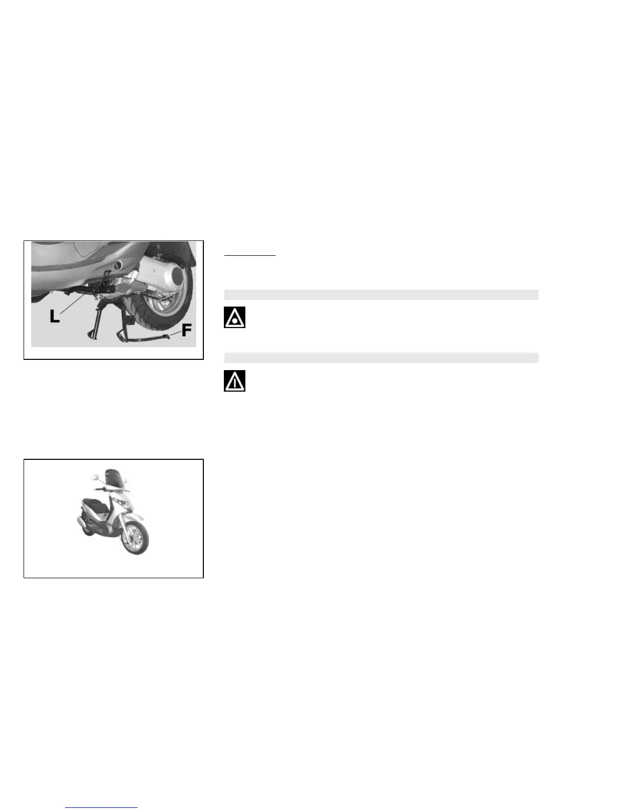 Push with your foot on the centre stand's fork «F» while lifting the vehicle backward,