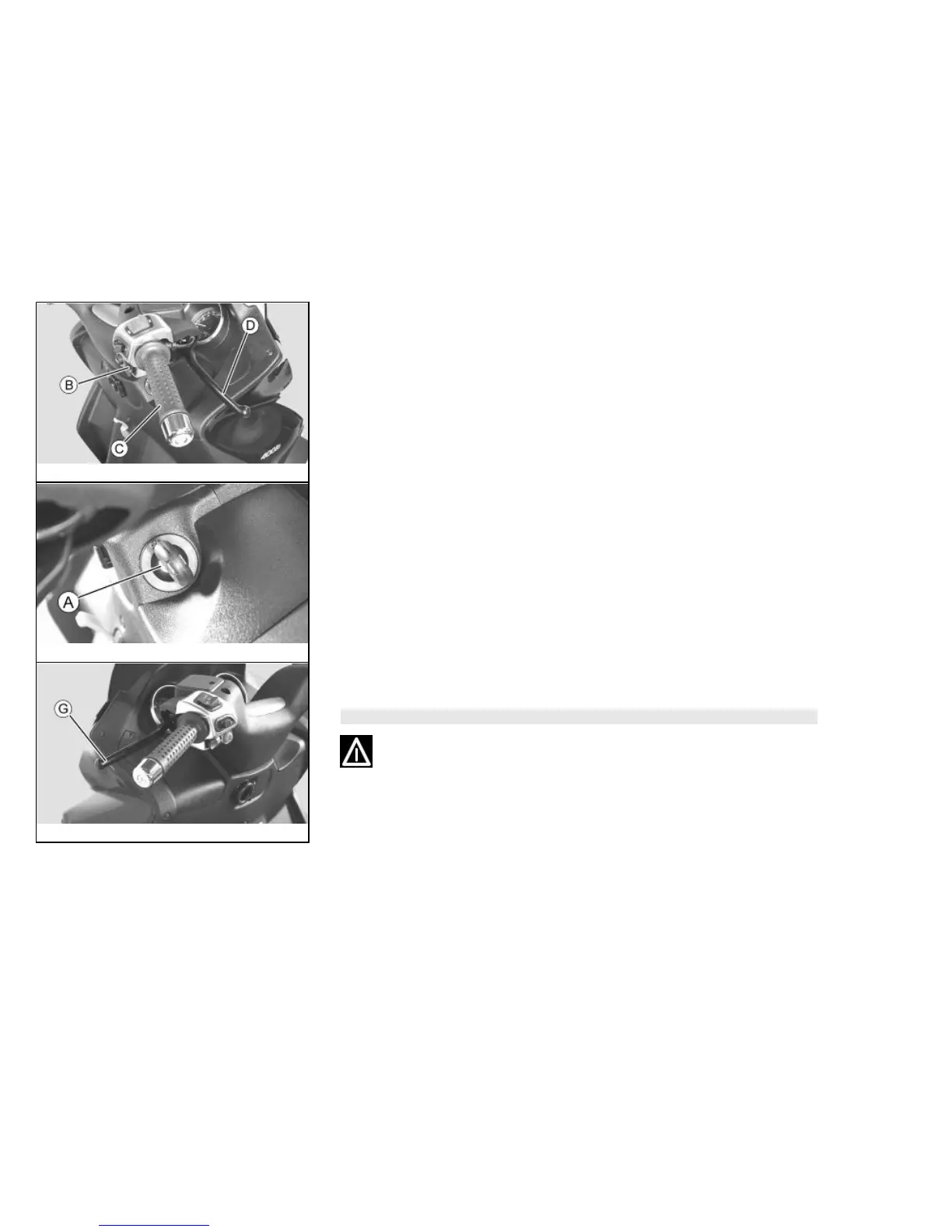 5. Pull either the front, «D», or rear brake lever, «G», then press the starter button