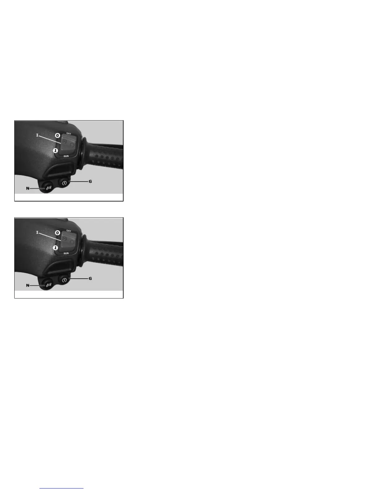 To start the engine, press the starter button "G" while pulling either of the two brake