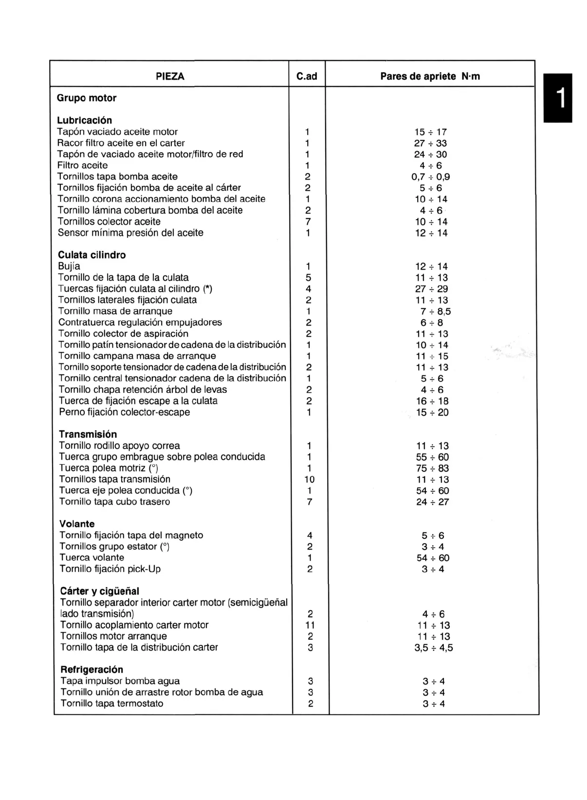 Tabla de pares de apriete