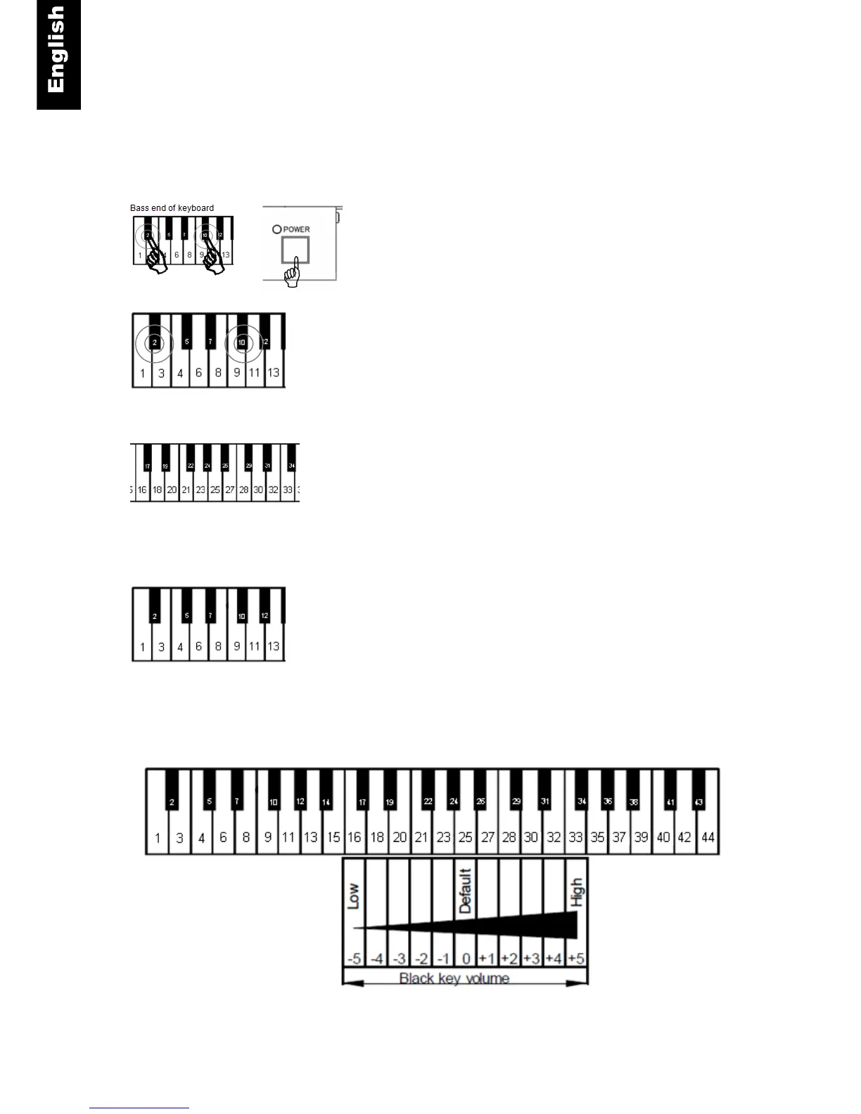 Piano key 16, 18, … 32 or 33 - Select the volume level that best
