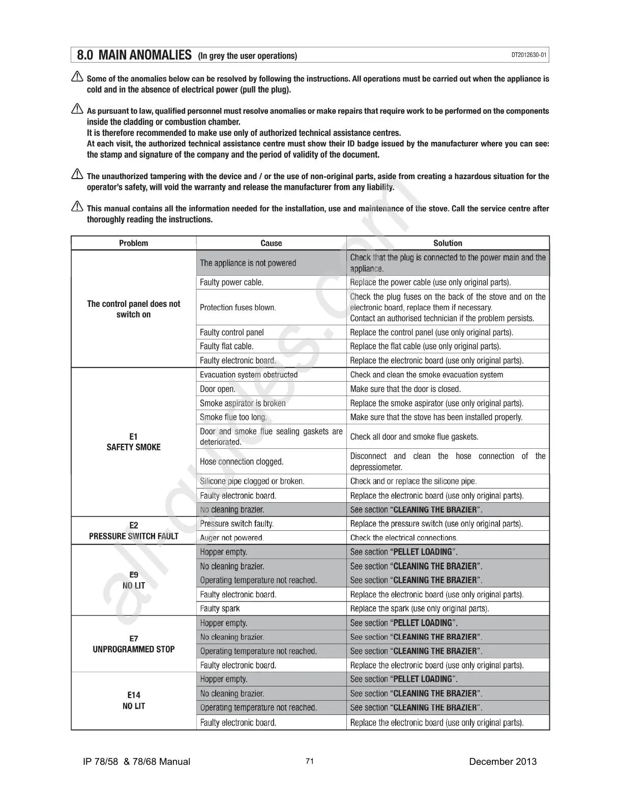 Piazzetta IP 78/68 - Troubleshooting and Error Codes; Main Anomalies and Solutions