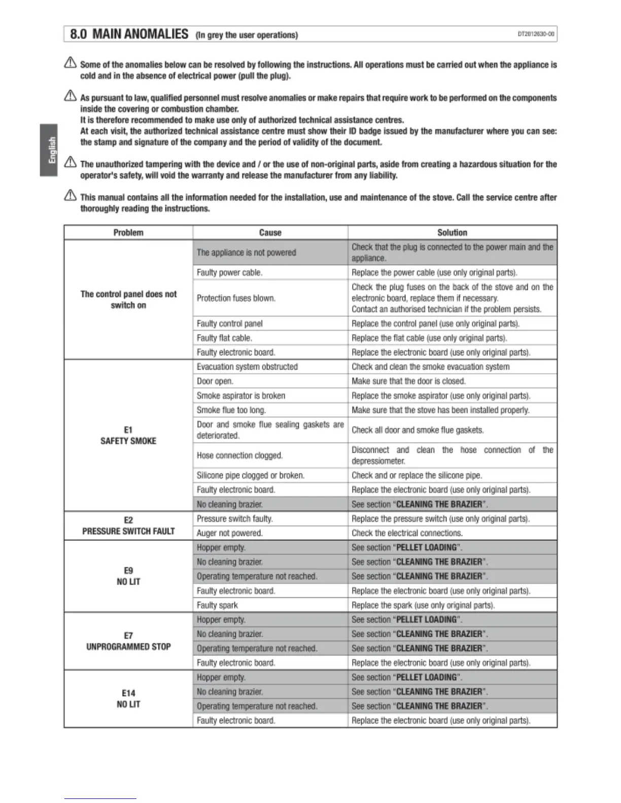 Piazzetta LINE - Main Anomalies and Troubleshooting; Control Panel Not Switching On; E1 Safety Smoke Error; E2 Pressure Switch Fault