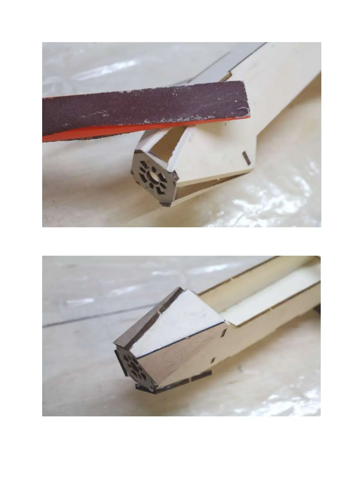 Sand fuselage side panels + upper + lower planking at an angle on fuselage tip