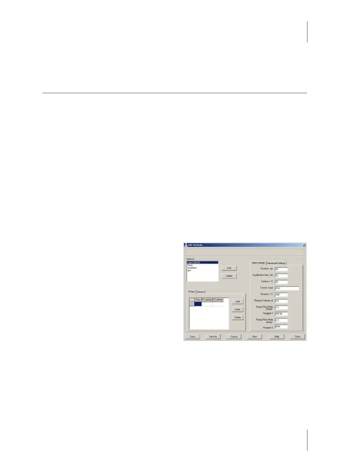 P1, ml/min Enter the desired flow rate for Pump1, between 0.05 and 1.5 ml/min. (For example, 1.3 ml/min.